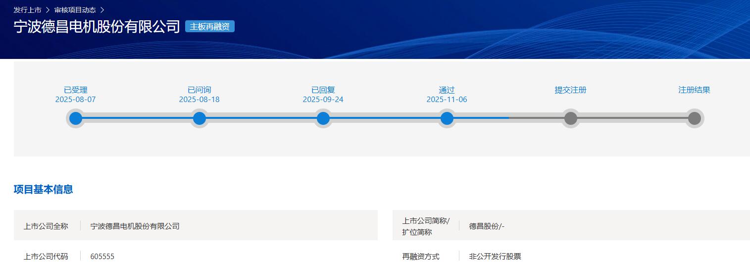 中国上海 (2021-11-07) 讯 据上海证券交易所网站消息 11月6日宁波德昌电机股份有限公司(证券代码:605555 证券简称:德昌股份)非公开发行股票成功获得通过。